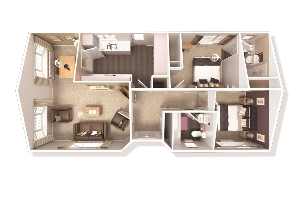 This brand-new, modern-furnished Willerby Hazelwood (42'x20') luxury lodge is perfect for those looking for a detached, easy-to-maintain, bungalow-style leisure property. The lodge has a spacious kitchen with integrated appliances, dining room, and comfortable living room. There are two double bedrooms, an en suite and a bathroom.