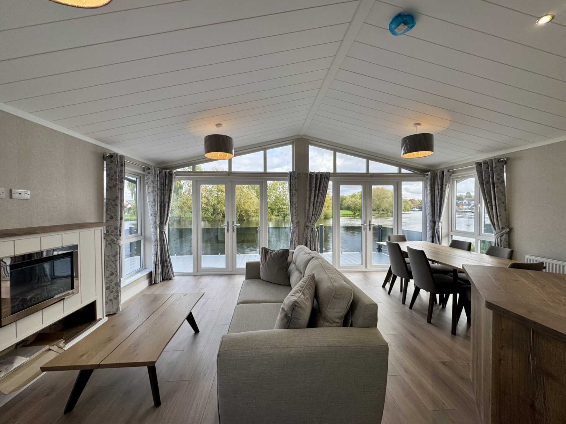 This brand new, modern-furnished Omar Kingfisher (40'x20') luxury park home is perfect for those looking for a detached, easy to maintain, bungalow-style retirement property. The home has a modern kitchen with integrated appliances, dining area and living space with doors leading to the decking. The master bedroom has an en suite and dressing area, there is a second bedroom with twin beds and a bathroom. This waterside property include a large decking with stunning views and a mooring on the River Thames.